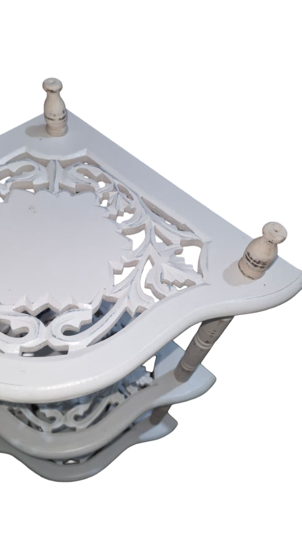 Wooden 3 Shelves Corner Table | Mini Corner Stand (White Antique Finish)